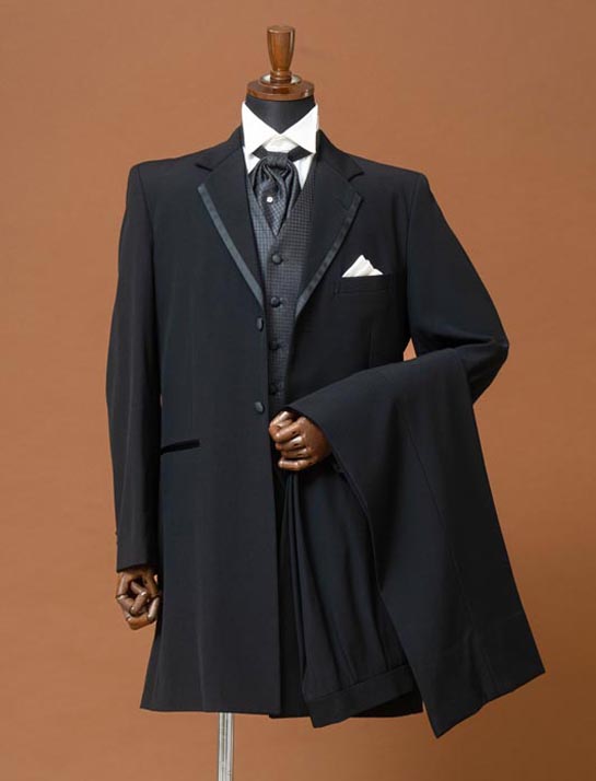 品のある光沢と2枚仕立てのベストが目を惹くフロックコートデザインのタキシード