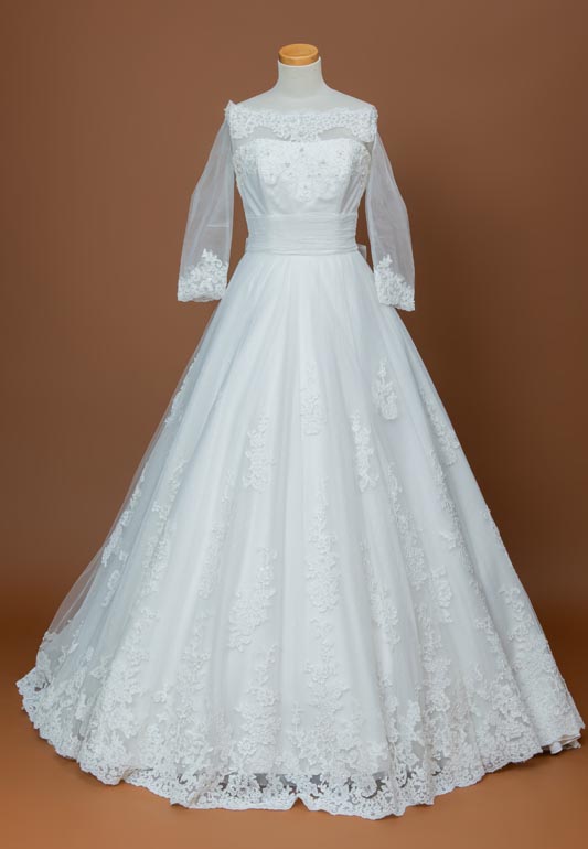 - ボリュームが充分にあるAラインドレス。こちらのドレスはトップス部分のブラウスが取り外し可能なドレスです。 2通りの雰囲気を楽しむことができるのでお色直しをしない方にもおすすめの1着。