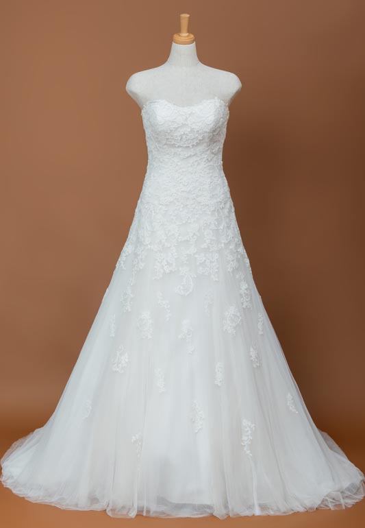 - 立体的なバストカットとトップスからヒップラインまであしらわれたレースが、女性らしいフェミニンさと色っぽさを感じさせてくれる、大人の女性におすすめのドレス。