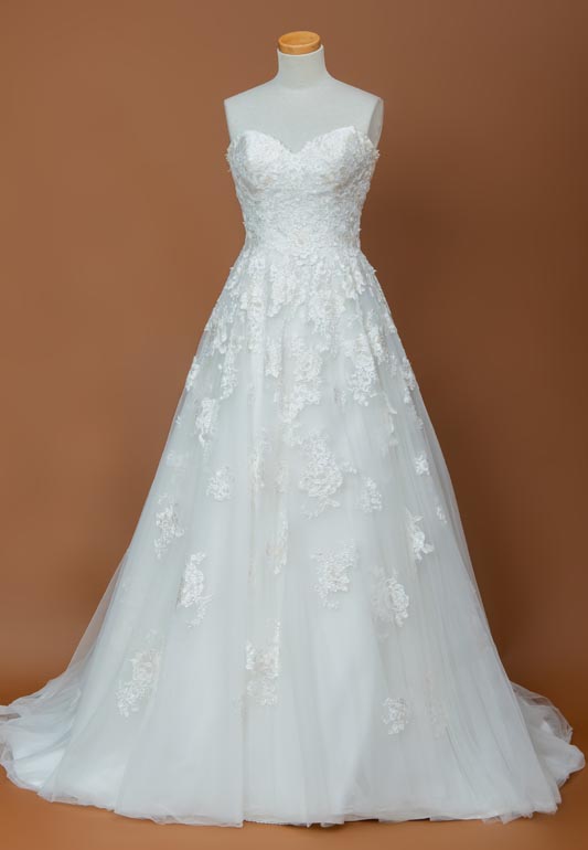 透明感のあるチュールに立体感のある花のレースとスパンコールの贅沢なAラインドレス