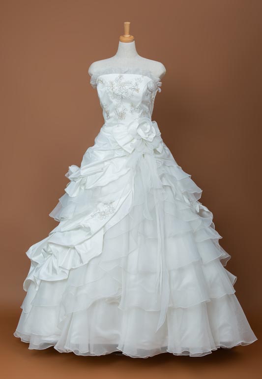 - ボリュームたっぷりな15号から19号のAラインのティアードドレス。こちらのドレスはトップス部分のヨークが取り外し可能なドレスです。 2通りの雰囲気を楽しむことができるのでお色直しをしない方にもおすすめの1着。
