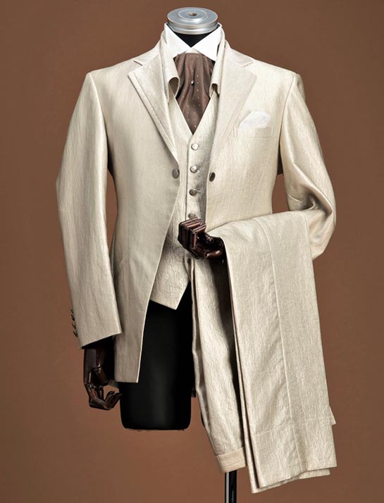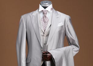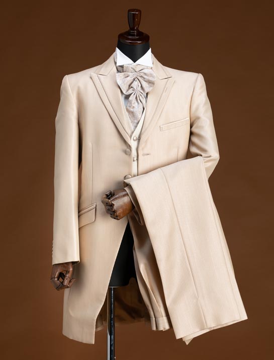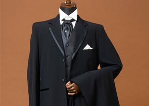 品のある光沢と2枚仕立てのベストが目を惹くフロックコートデザインのタキシード