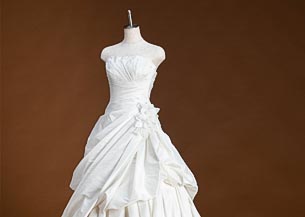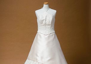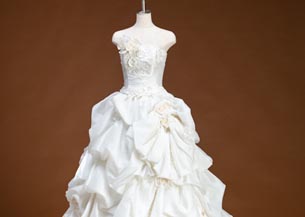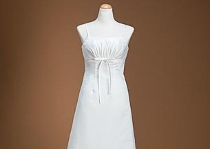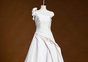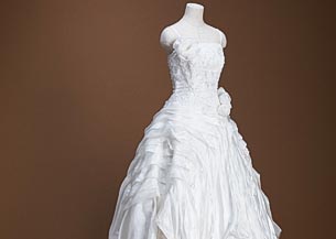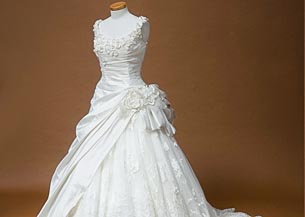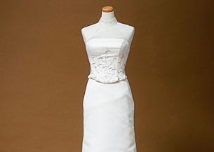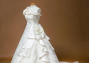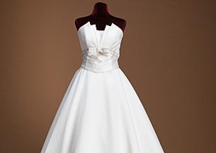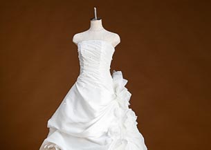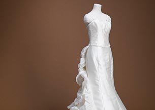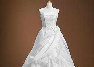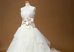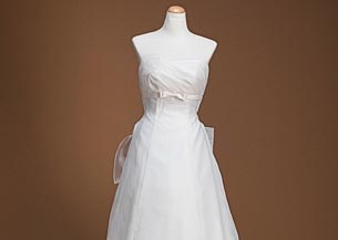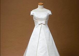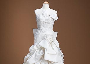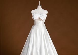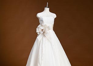 リボン部分はまるで大きなジュエリーを身に纏っているような印象。ミカド素材の上質さが引き立つAラインドレス。