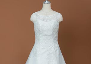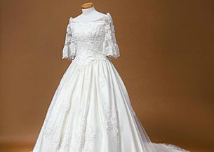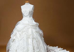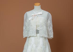 薄い生地に透かし模様の刺繍を施したレースがクラシカルで可愛い。シックで上品な印象を与えてくれる袖のあるプリンセスタイプ。