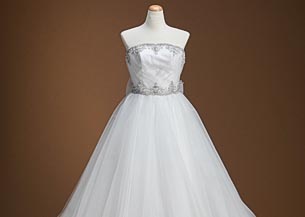1番のポイントはウエストのサッシュベルト。裾には繊細なレースでアクセントを加え高級感のある1着に。