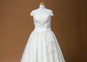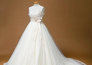 ボリュームのあるシルエットで可愛いデザイン。スカート部分は透明感のあるオーガンジーと重厚感のあるミカドカットワーク。