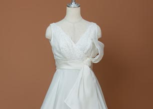 たくさんのリボンが施された可愛らしい雰囲気のAライン。リボンを外して清楚な雰囲気のドレスとしてお召し頂くのもオススメ。