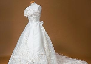 トレーンにはグラスオーガンジーを使用しバックスタイルの華やかさが圧巻。重厚感のあるミカド素材のAラインドレス。