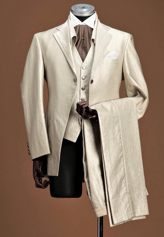 - 華やかなシャンパンゴールドのタキシードです。明るく主役感のあるシャンパンカラーが新郎をエレガントに演出。また、ネクタイのブラウンがアクセントになったコーディネートです。タキシードの生地は.ワッシャー加工になっています。