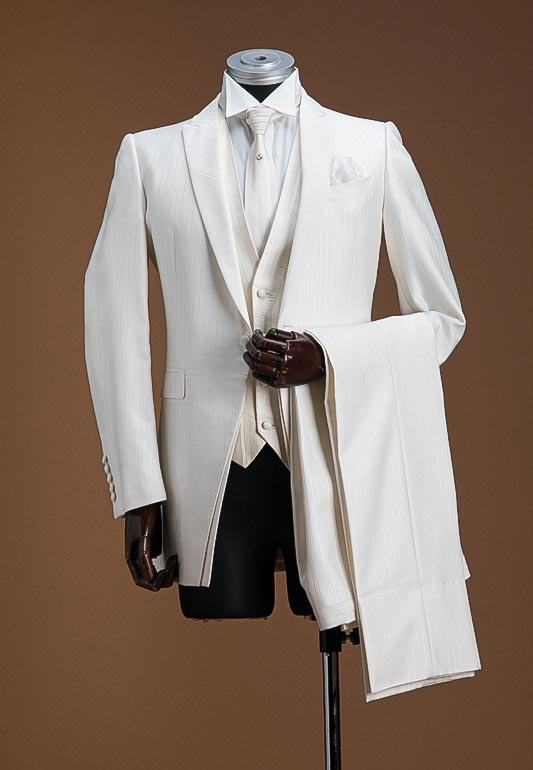 - 爽やかなオフホワイトのミドル丈のタキシードです。上品な艶があり、中のベストもジャケットと同じオフホワイトで清楚感漂う気品のあるデザインです。