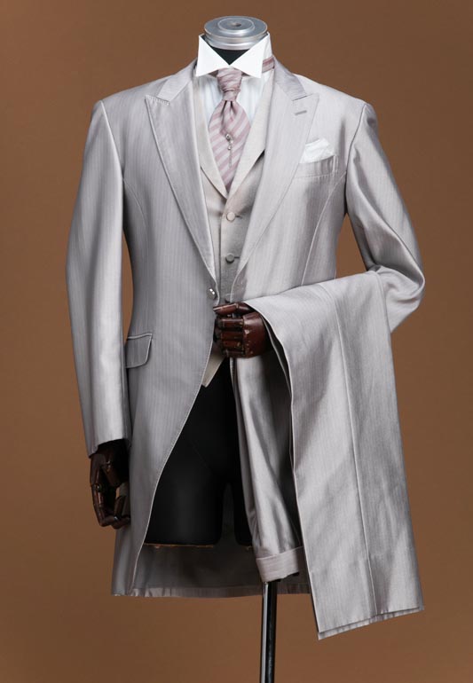 - その際、ワイシャツは3回ほど捲るとよりすっきりします。 ジャケットのカットはモーニングカット。ジャケットの前から後ろの裾にかけてなだらかな曲線にカットされています。シルバーは参列される方とも色が被らないのでより主役感を出すことが出来ます。