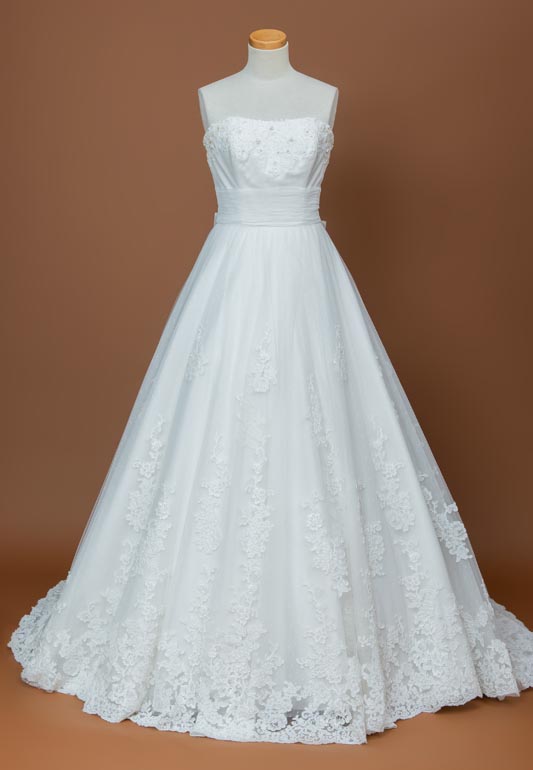 - ボリュームが充分にあるAラインドレス。こちらのドレスはトップス部分のブラウスが取り外し可能なドレスです。 2通りの雰囲気を楽しむことができるのでお色直しをしない方にもおすすめの1着。