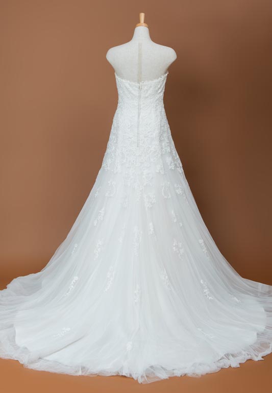 - 裾にチュールでフレアーをとった、細身のフィット&フレアーのシルエットはレストランなどの会場でも動きやすく、それでいて華やかさも感じさせてくれます。マーメイドに憧れはあるけど抵抗があるような方にもおすすめのドレスです。