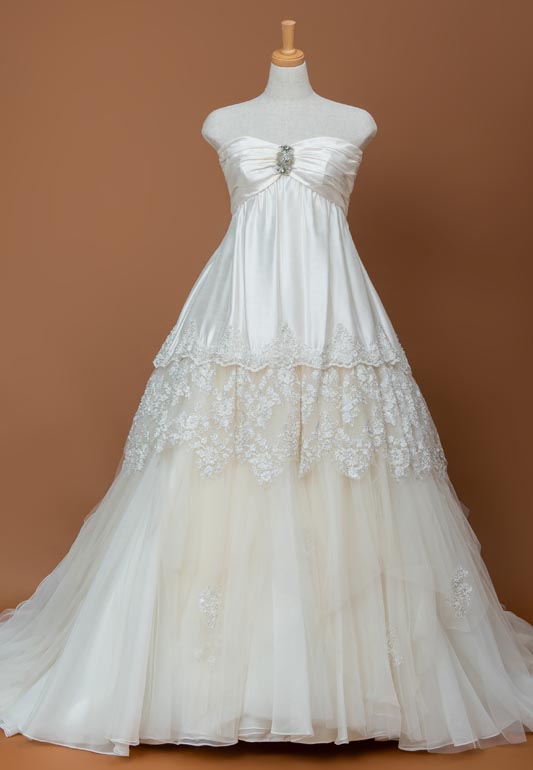 - 胸元にギャザーを寄せてテントラインに広がるプリンセスエンパイアドレスは胸元からシャンタン~ビーディングレース~チュールとだんだんと軽やかさを増しながらボリュームupさせた絶妙なバランス。
