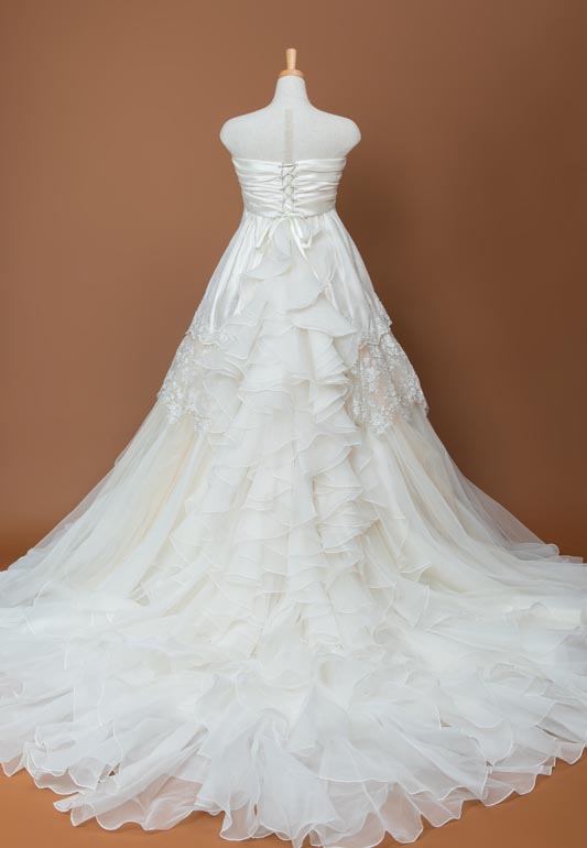 - バックにはオーガンジーのフリルを重ね流れるトレーンを構築しアンティークでロマンチックな空気感が漂うドレスです。