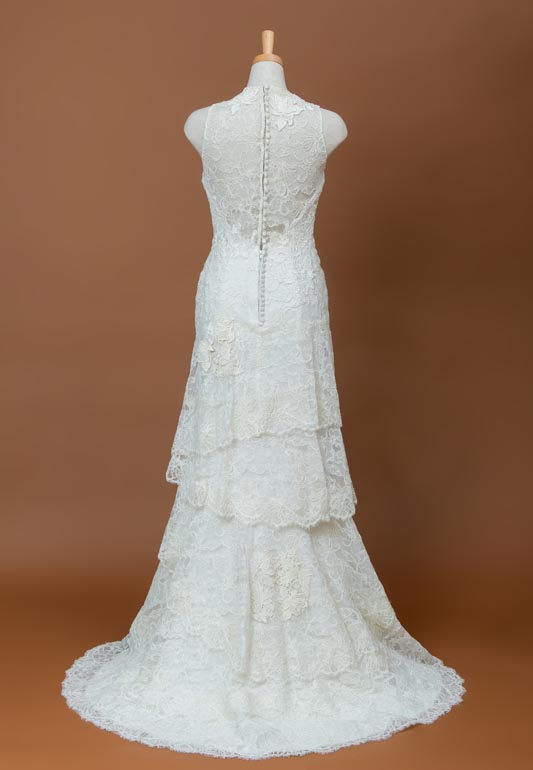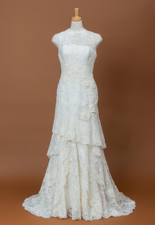 - 上質なコードリバーレースをランダムに重ね、スカートに程良い動きを作り出すスレンダードレスです。ふっくらした厚みのあるレースはナチュラルな雰囲気を演出、デコルテや腰元まで空く透け感のあるレース・くるみボタンで大人っぽさも演出します。