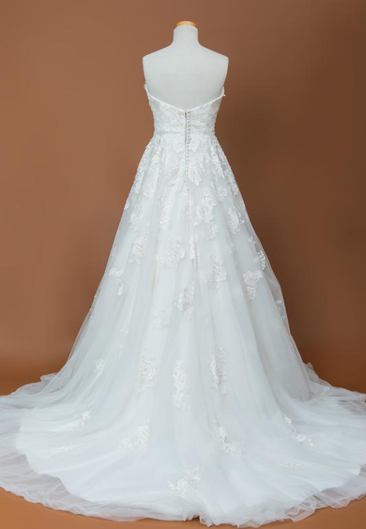 透明感のあるチュールに立体感のある花のレースとスパンコールの贅沢なAラインドレス