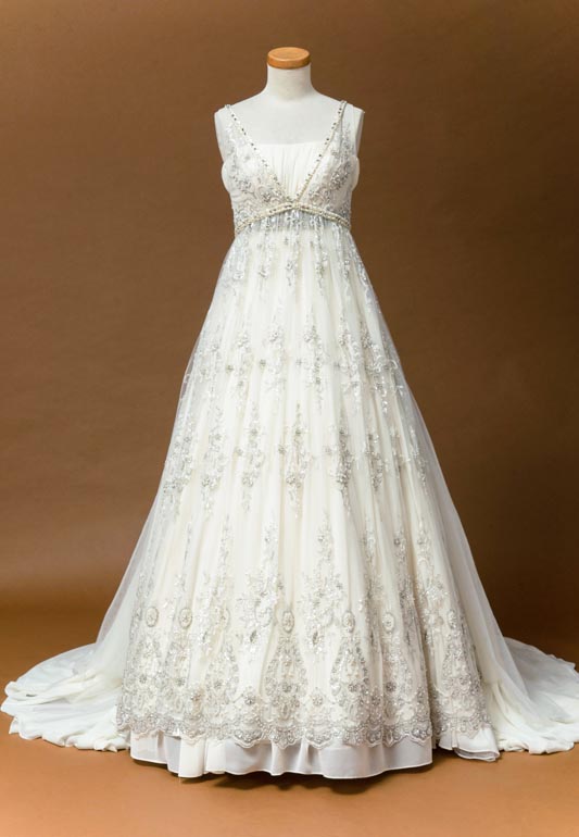 - エンパイアとは胸下切り替えのドレスラインのことで、ハイウエストなので脚長効果は抜群です。こちらのドレスは付属でオーバードレスが付いていて、Vネックタイプのドレスにもなります。挙式ではベールを使用するのでシンプルなビスチェタイプのドレスにも。