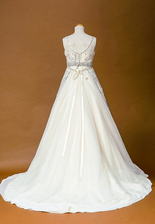 - 披露宴ではベールを外してオーバードレスを着用し、ドレスの雰囲気を変えることができます。オーバードレスにはビーズがあしらわれておりほどよく煌めき、ボリュームレスなので家族婚やレストランウエディングなどにおススメです。