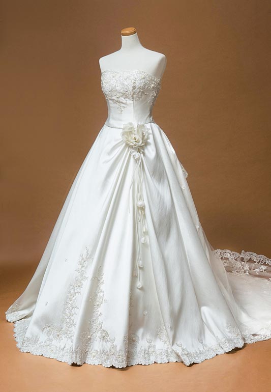 - 長く愛される正統派デザイン!ウエディングドレスの中でも根強い人気を誇るミカド素材のAラインドレス。