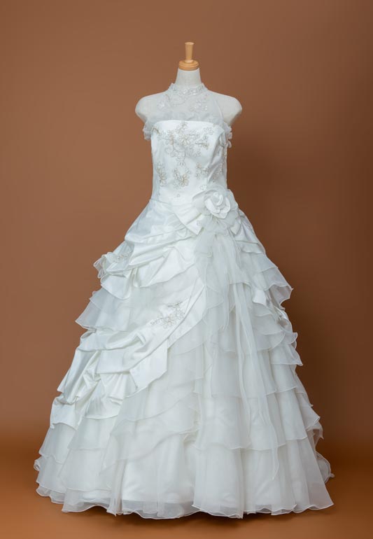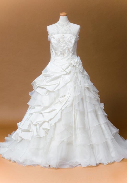 - ボリュームたっぷりな15号から19号のAラインのティアードドレス。こちらのドレスはトップス部分のヨークが取り外し可能なドレスです。 2通りの雰囲気を楽しむことができるのでお色直しをしない方にもおすすめの1着。