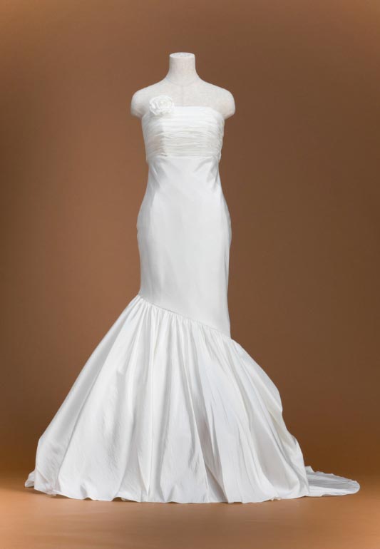 - ワッシャータフタ生地の7-11号のアシンメトリーのマーメイドドレス。ドレスの素材の中で上質とされるワッシャータフタ。ワッシャーとは布生地に洗いっぱなしのような風合いを入れる加工技術のことで、通常の生地よりも涼やかな印象を与えることが出来ます。光沢がありシャキッとした軽い素材のタフタ生地と合わさることで、上品な艶のあるドレスに仕上がっております。