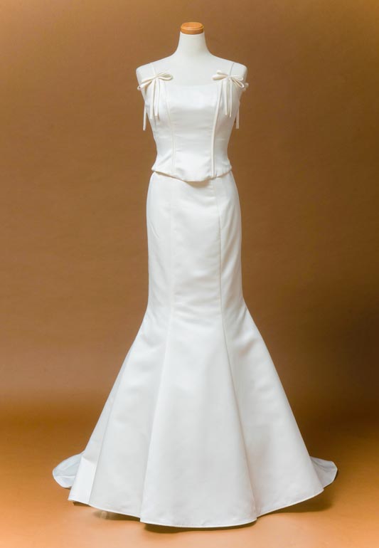 - また、スカートと身頃部分はセパレートになっており、サテン生地の光沢感で大人っぽさも出せますし、シンプルなデザインなのでベールやアクセサリーなどで小物をプラスして海外風花嫁のようなオシャレなコーディネートもできる一着です。